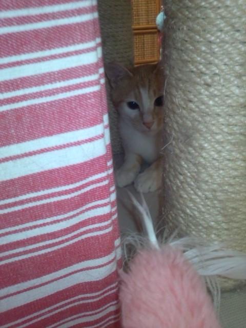 タワーの隙間からじゃらしを狙うシナモン