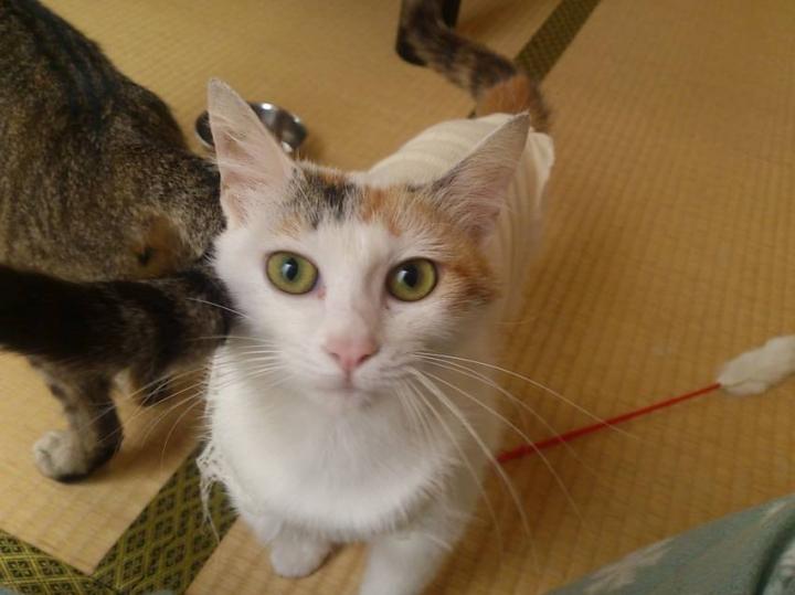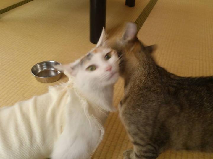 手術が済んだ三毛さん、べたべたの甘えん坊に変身♪かわいい猫さんになってます、おなかも順調に治っています!