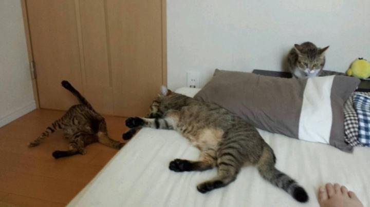 しばらくしてまた起きて、今度はダンナさんが金魚さんの水槽を洗い始めたので、その間金魚さんを狙わないよう、ワタシたちは寝室に隔離。