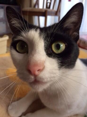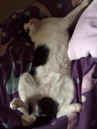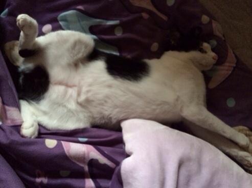 最近は窓のそばで寝ているのがお気に入りですが、夜中に決まって私の寝ている足元にきて、足に寄りかかりながらこのようなお姿。。。