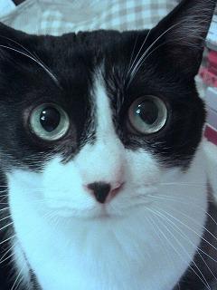 白黒ハチワレ、日本猫、普通の大きさだと思います、可愛らしい顔で、黒い長目の尻尾を