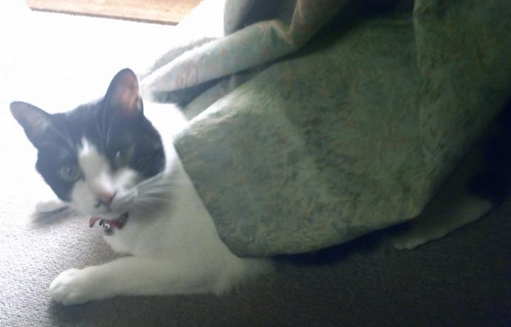 カーテンに潜ってます。