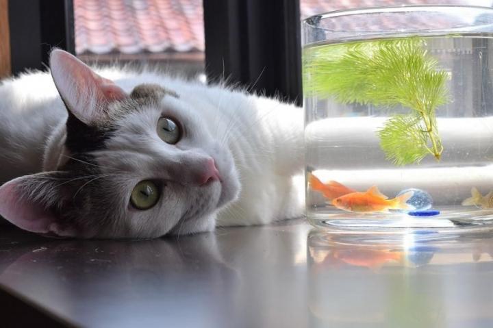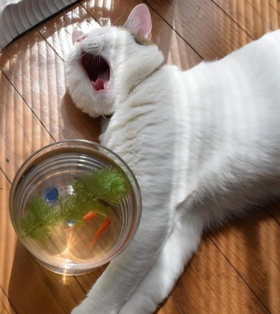 じっと金魚鉢をながめ、その動きを目で追っていますが、