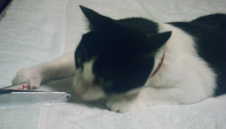 さて、今朝、ベッドに乗っているハチ君。あるモノを見せる。