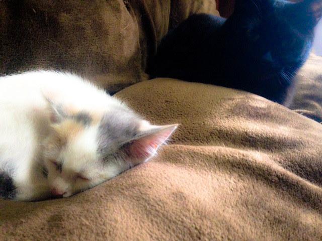小さいながらもなかなか肝のすわった様子。離乳食をたくさん食べてゴロゴロ喉を鳴らし、ぐっすり眠っています。安心しきった寝姿を見ていると、こんなに小さな仔猫をよくぞ助けてくださったと、あらためて感謝の気持ちでいっぱいになります。