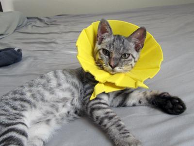 そして可哀相なことに、ものすごく痒いみたい。私と一緒だね!と喜びたいですが猫は掻くことを我慢できないので手作りカラーを装着。