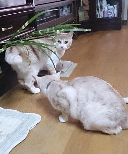 庭でプウがオシッコしたら、その上にモコが、またその上にクロがオシッコかけるんですよ~~(笑)