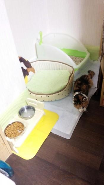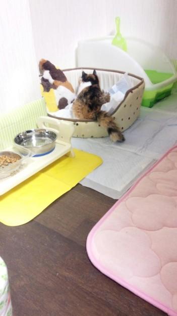 今までは、ケージの上にハウスがあってそこまでダンボールで階段をつけてあげていたのですが、ここ最近その段差も辛そうだったので、思い切ってバリアフリー?にしたら、トイレは失敗しなくなったものの、ニューハウスはお気に召さず、ハウス前の狭いところでのおくつろぎ・・・。