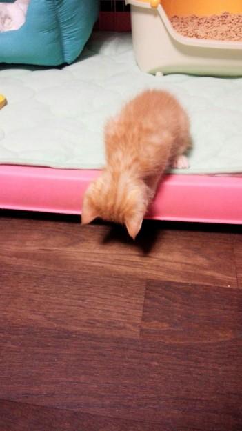 家に到着して、ケージに入れてあげたらあちこち探索した後・・・、お・降りれにゃい・・・。
