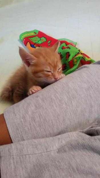 我が家にきて2日目の斑ですが、夜中にみんなを恋しがって鳴いたりもせず、眠くなるとお気に入りの場所で寝たり、いつのまにか自分でベッドに戻って寝たり、誰かが側に行けばゴロゴロゴロゴロ・・・。