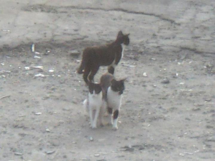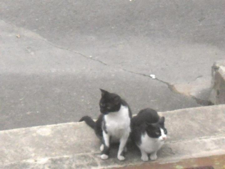 昔からいてたまに出没していた(今回一時期里親募集で登録した子の父と思われる)強い雄=まだら(白黒がまばらなので)は、2匹を避妊してからは1度しか見かけておらず、その頃から3匹でいる姿が見られるようになった。