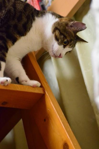 新入り子ねこと どう接していいのか、ちょっと悩んでいるソノシロウくん。子ねこたちの様子を、梯子の上から興味津々で眺めています。