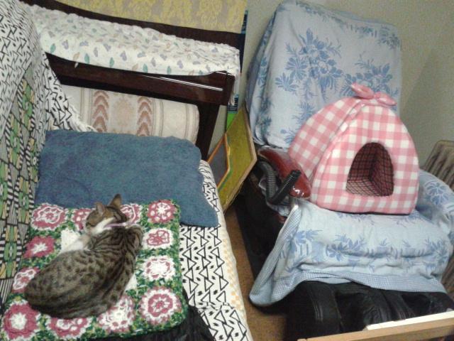 中に入れてみたのですが、出てきて 横のソファに置いてある彼の従来の私が編んだクッションに寝ております。