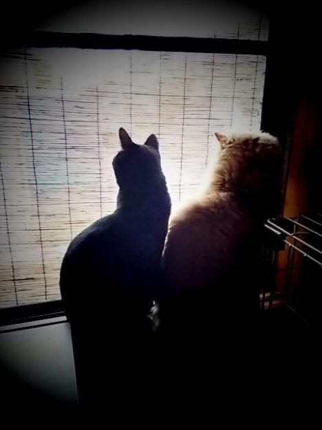 今朝、窓際で仲良く(仕方なく?)並んで観察中のお二人さん