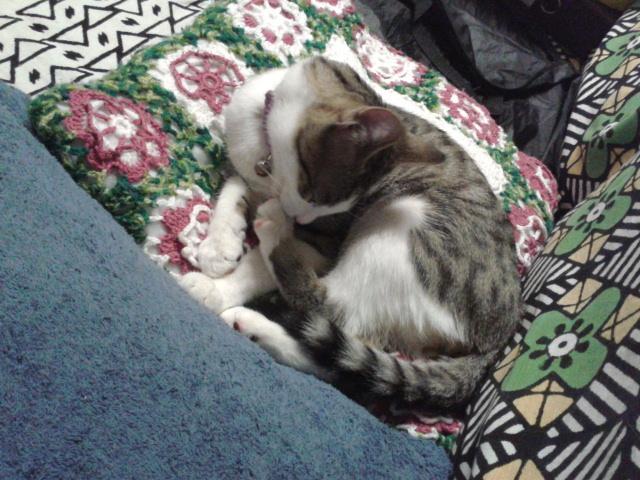 ソファの上の彼のクッションで 毛繕いをし、そこで寝た。。。