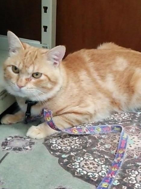 事務所には2才のオス猫がリードで繋がれ、座布団に鎮座