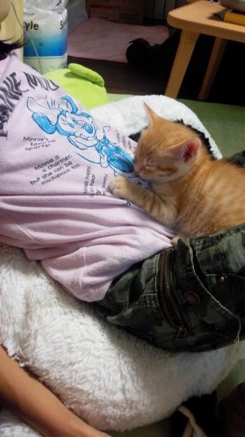 その後、膝の上の快適さに目覚めた斑は娘の膝枕でzzz