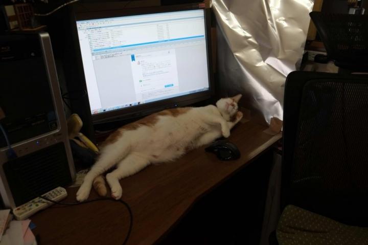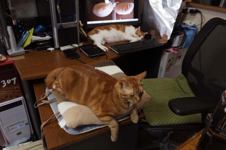 猫がキーボードの前に居座ると作業が出来ないので、思い立って普段は机の下にあるキーボード用のテーブルを横に出し、座布団をひいて猫の居場所を作ってあげた。が、小太郎はなんとかそっちに行ってくれるのだけどどびんが行ってくれない(涙)。仕方なく少ないスペースにキーボード置いて頑張るんだけど、カチャカチャしてるのに興味が有るのか、キーボードをたまにさわりに来るので困りもの…。