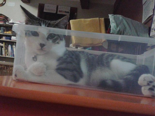 ブイ~~~ンブイ~~~ンという音と共に赤いライトがフラッシュするチェーンソーを頭に当てられても、箱の中に陣取っている。