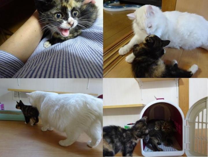 子猫同士は、もうすこし経てば仲良くできるとは思うけど、みーちゃんママの我が子を守る態度、家族の絆が強すぎてさびちゃんの入り込む余地は、今のところなさそう