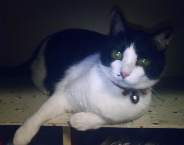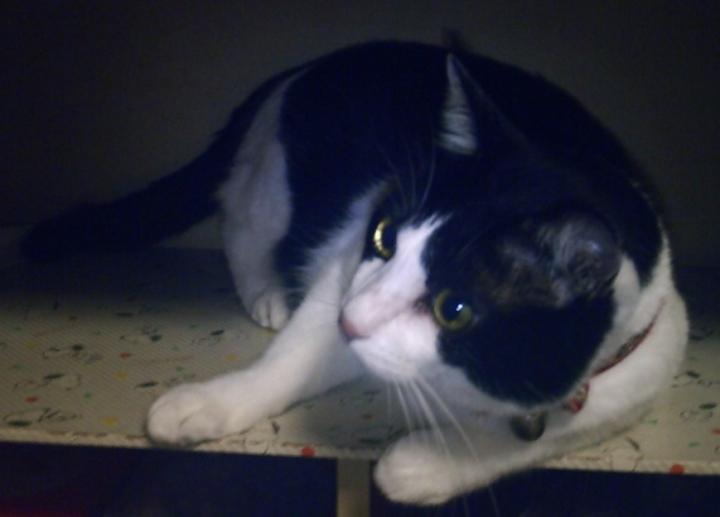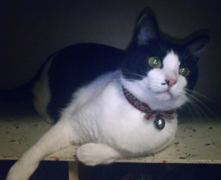 ブラインドをおろしてて部屋が暗かったので、ハチ君のお顔にライトを当てました。