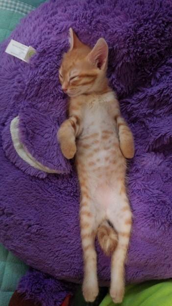 その辺で寝ちゃうので、クッションに移動させるとまもなく・・・。びよ~ん