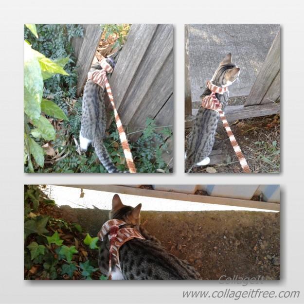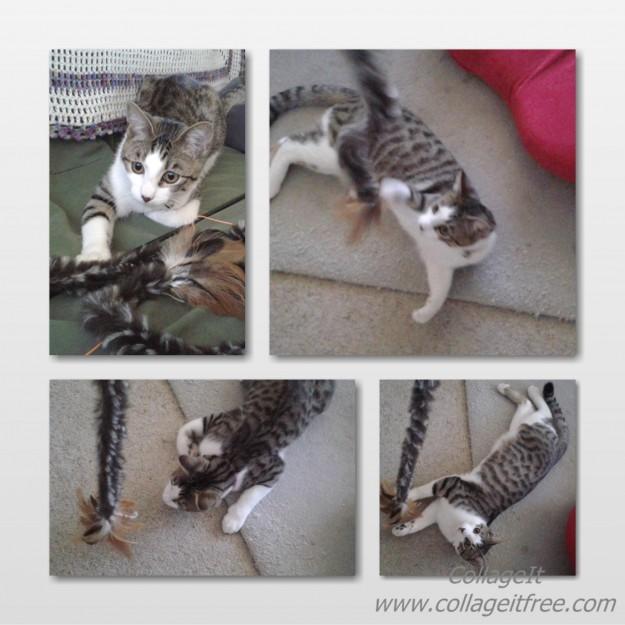 1時間弱後に、無理矢理中に連れ入れられて不満なのか、ダダダダ走って暴れているので、猫じゃらしで遊ぶ。