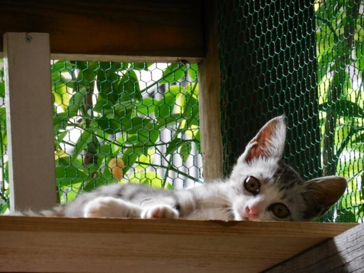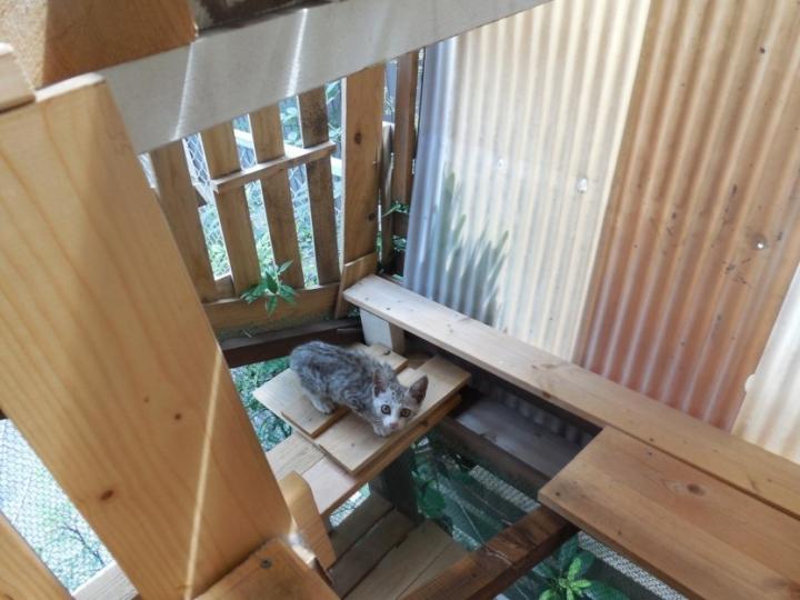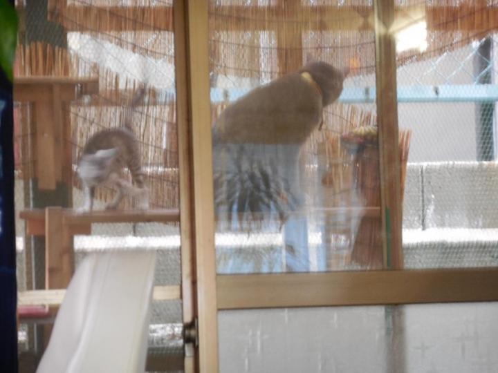 あぁ~ふさいだ猫よけをはねのけ・・・外に逃げた(T,T)