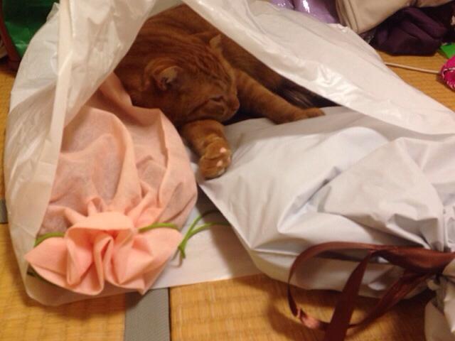 これは昨晩の様子。プレゼントの袋でネンネしています。