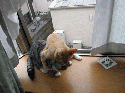 乗っかって甘噛みしたり、頭を舐めたりしてます。