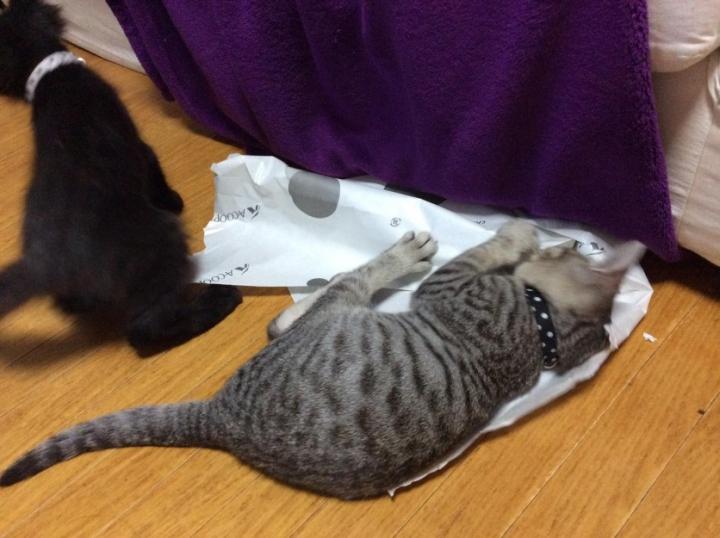 頂き物の包装紙でハッスルして、空中戦を繰り広げて面白いのに、そんな時はカメラ持ってなくて残念。