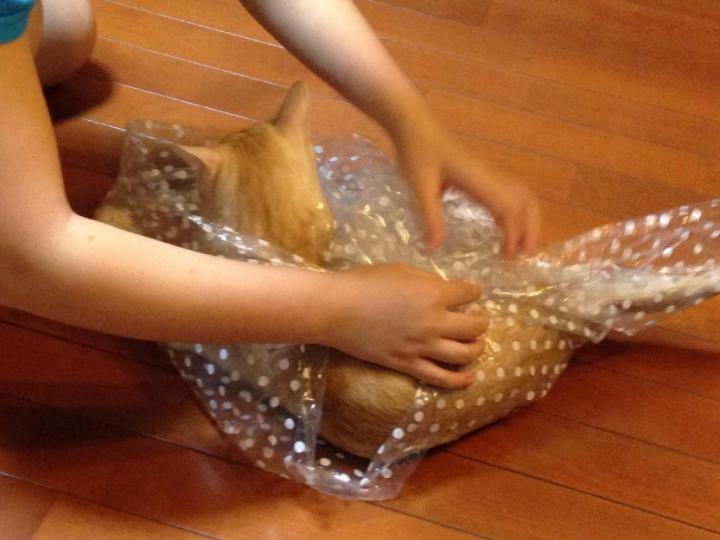 ハン兄は果物包んでたビニール風呂敷が気に入って