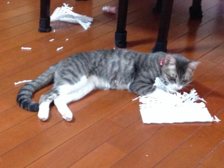ナミちゃんは桃の箱に入ってた緩衝材をちぎってバラバラに