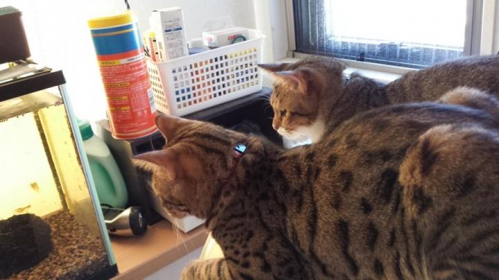 最初はサクが中のドジョウさんに興味津々で、毎日のように覗いてたんですが、このところニコも参戦。
