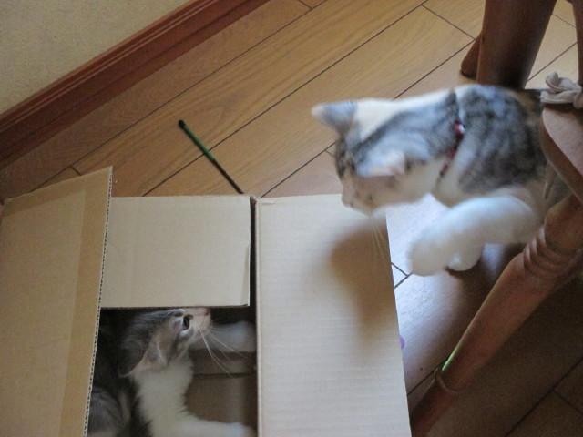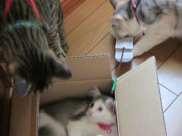 このはが箱を見つけて中に入ると寄って来る2ニャン