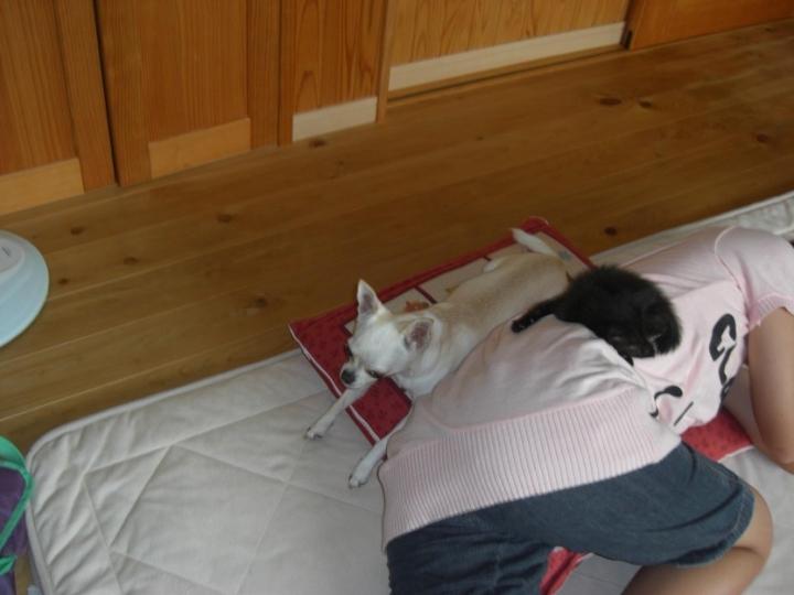 昼寝している娘に勝手にのって一緒に昼寝する子猫。