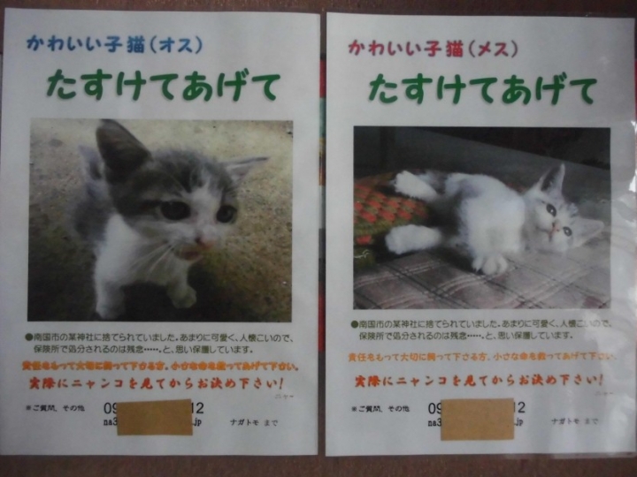 今回、私は子猫二匹。それも相当可愛いので、楽観し、写真もそこそこに写し、まぁ、あまり問い合わせが殺到されても、めんどうだ。