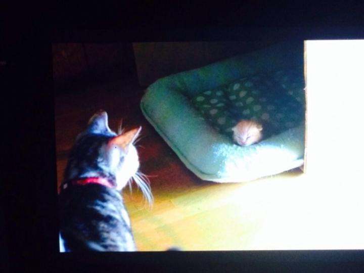 今朝、レッドタビーの子猫がマットのへりまで出てくると、モカが「ぐるる、みゃう」と優しく鳴きながら見守っていました。