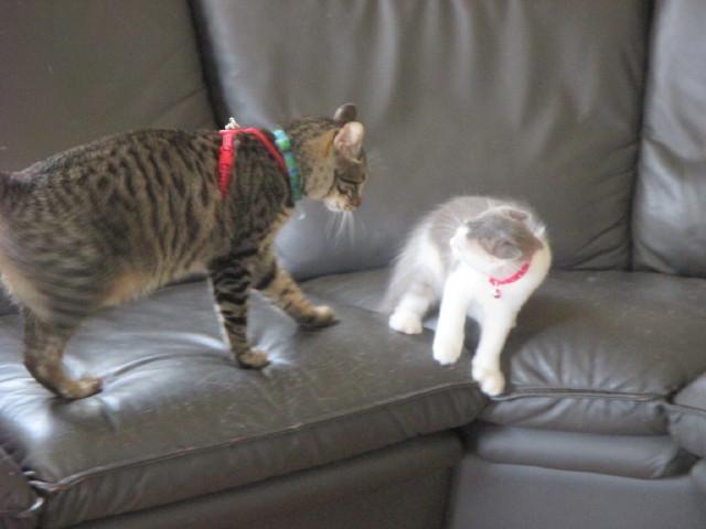 2ニャンともそれぞれにおもちゃを持って来て、気を引きますが・・・