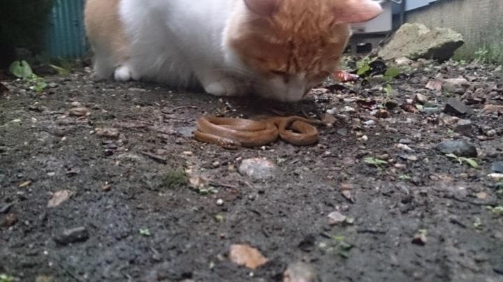 私が横取りしようとしたら、ミルクが口にくわえて玄関の外へ。