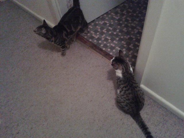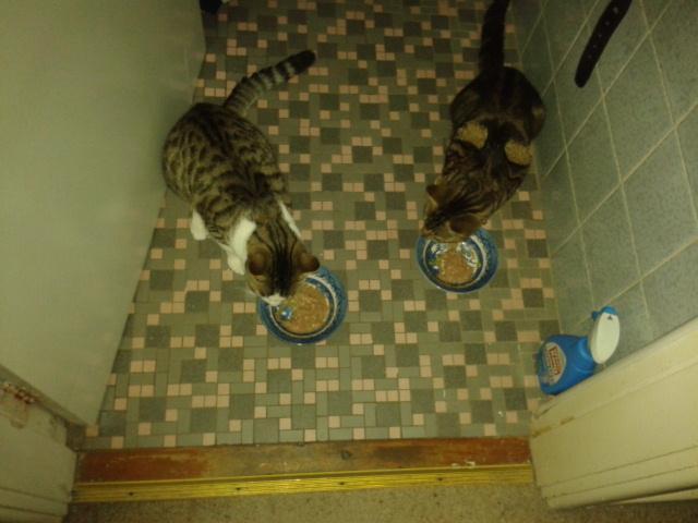 バスルームに 2にゃんがいたので、そこに ごはんを持って行きました。