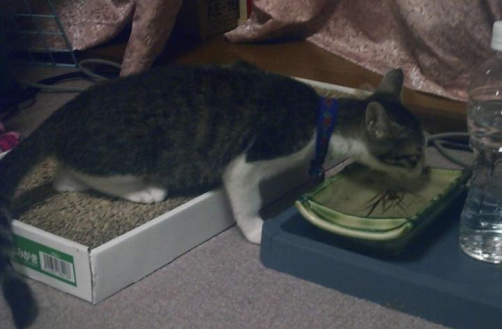 「あたち、今日初めて、お家に来たよちょの人に頭ナデナデちてもろたわ。緊張してノド渇いたぁ~。おみじゅ、ゴクゴクゴク…。」