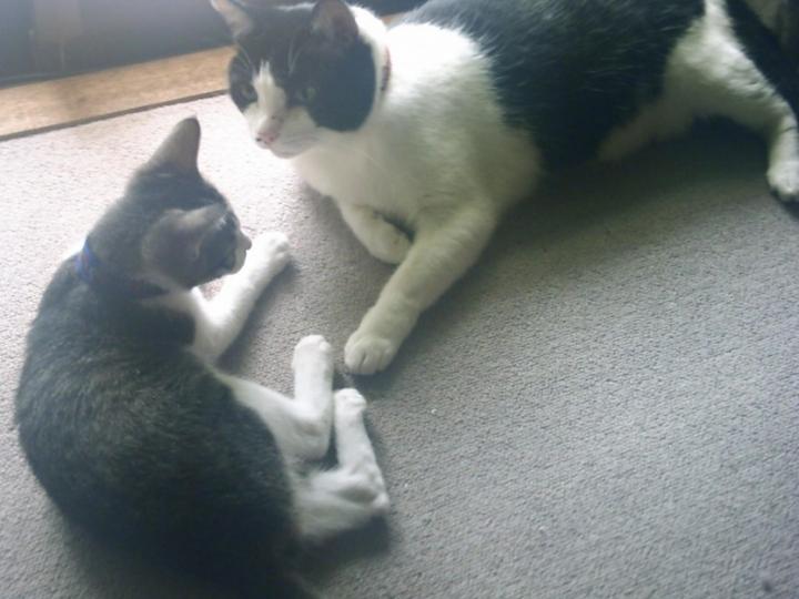 お客様は、玄関で、半時間ほどおしゃべりされただけでお帰りになりましたが、その間に、様子を見に顔を出すハチ君。