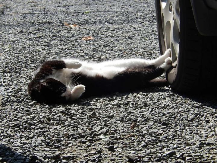 エンジンのかかった車のタイヤに両腕をついて、クンクン。