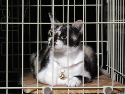 ケージに入る新人猫さん 三毛まだら猫(メス)。生後1歳2か月(推定)。