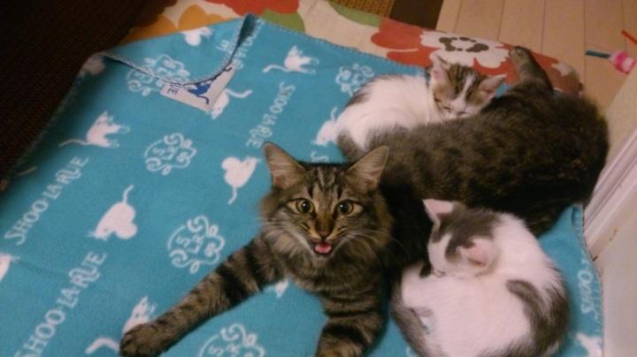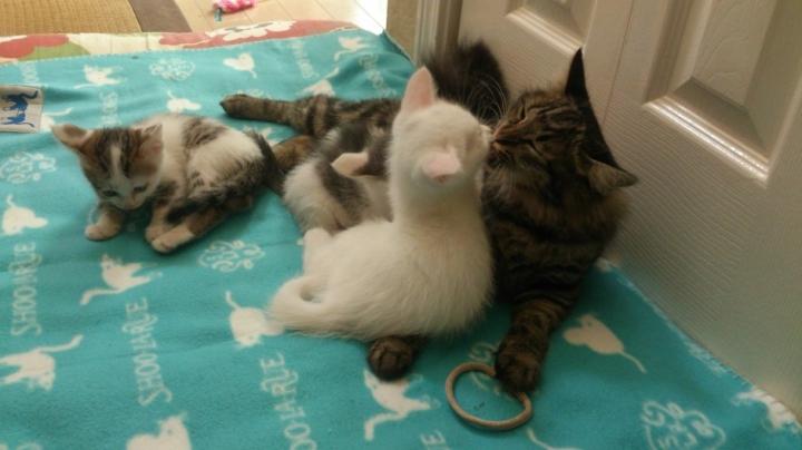 ナンさん子猫たちとだいぶ馴染んで、わりと子育て手伝ってくれていました