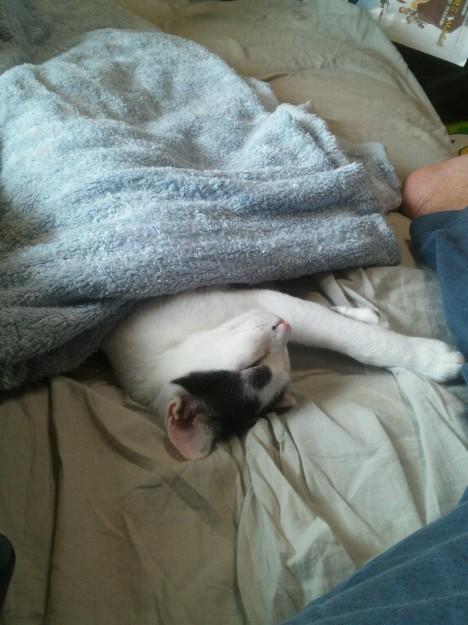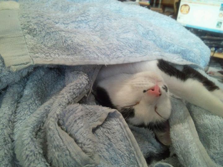 今度は昼寝を始めたので畳んだタオルケットを掛けてあげました。