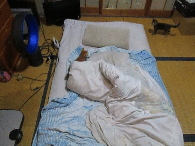 お食事の後は未だ十分にお掃除の済んでいない、オイラの寝床で運動です。
