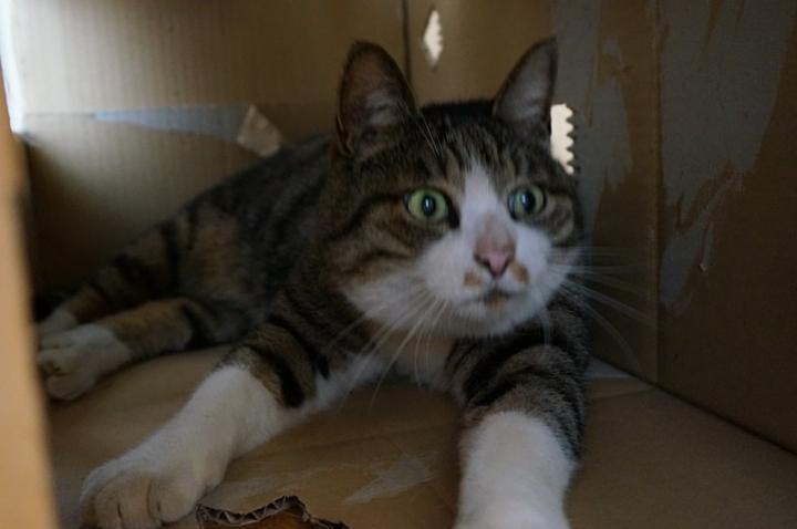 チャムが若かりし頃遊んでいたダンボールに篭城するライカ。