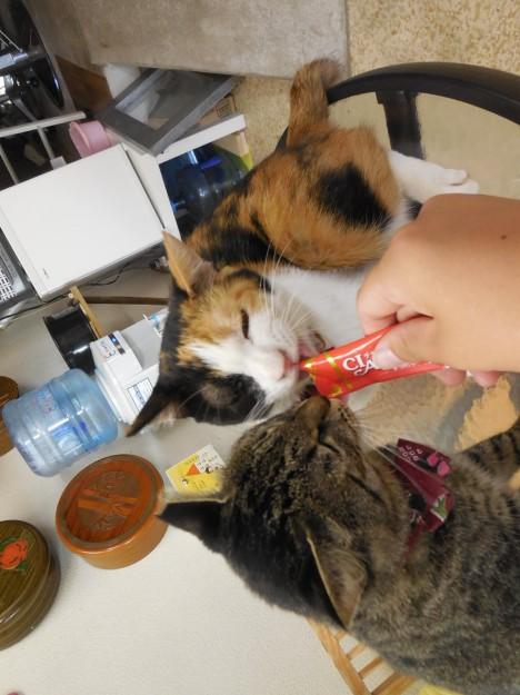 強引なチエに嫌がりながらオヤツをもらっているりんちゃんでした